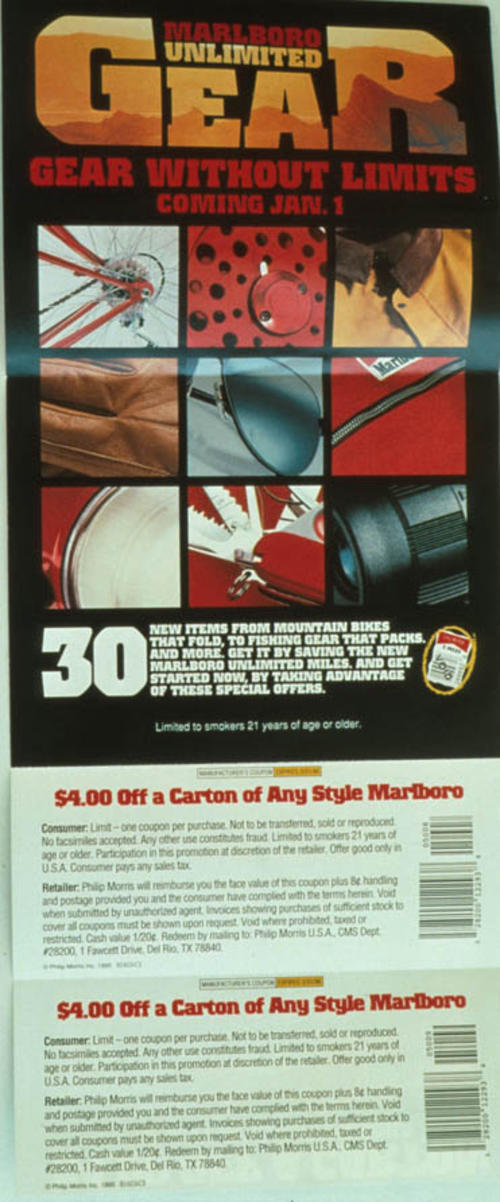 This is a direct mail piece announcing the 1/1/96 launch of the Marlboro Unlimited catalog. Note the discount coupons. These are computer coded so the company can track which mailing list recipients redeem them. RJR and B&W are set up to do this as well with the coupons they mail out. In 1995, Philip Morris' direct mail operation had 35 million names in its databases, and the company expected to spend $160 million on direct mail that year.