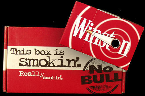 Red cardboard box with smoke signal messenger inside. Coupons also included. "This box is still smokin'"