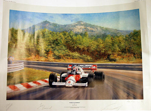 "World Champion" by Alan Fearnley, signed print 530/850. To commemorate Niki Lauda becoming the Formula One World Champion at Estoil 21st october, 1984. Marlboro car racing image.
