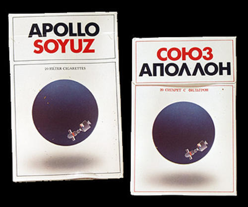 Apollo Soyuz rendevous in orbit, 1970s. Cigarettes a joint production of Philip MOrris & Glartabak
