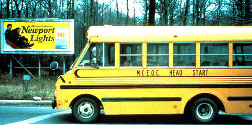 School bus driving by Newport billboard. Whether or not billboards are 'intended" for an adult audience, they reach kids.