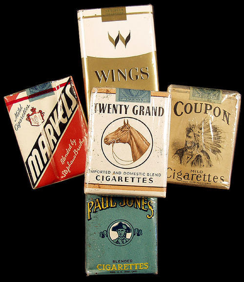 Price competition in the 1930s boosted the fortune of a number of minor manufacturers. Wings, Paul Jones, Twenty Grand, Marvels & Coupon were among the brands that prospered. Philip Morris leveraged its success with brands such as Paul Jones to become one of the big sic makers. On display: Coupon (1932), Paul Jones (1941), twenty Grand (1942) and Marvels (late 1950s)