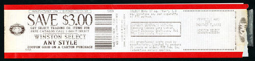 Checkout coupon from ACME, red and white. "Save $3.00 on select carton. Select merchandise is advertised." Surgeon general's warning on each coupon; notes attached.