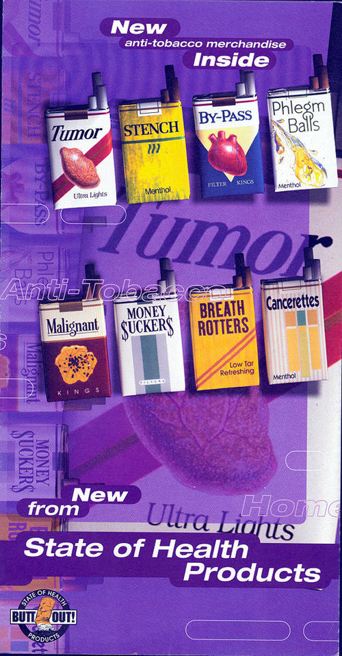 Catalog of 34 anti-tobacco items. Catalog and items put together by State of Health-BUTTOUT! www.buttout.com