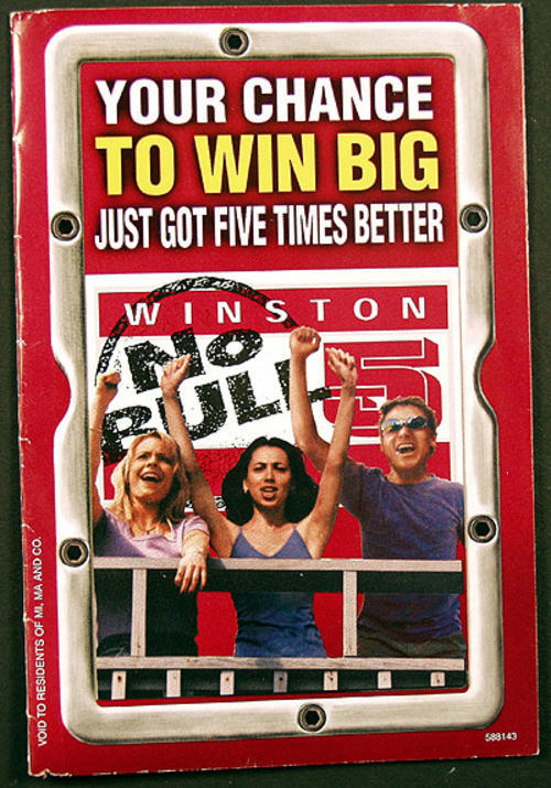 Pamphlet explaining chances to win the NO BULL 5 sweepstakes (chance to go to a race and win $1,000,000). Nascar Winston Cup 2001 schedule also printed on a perforated card. young people.