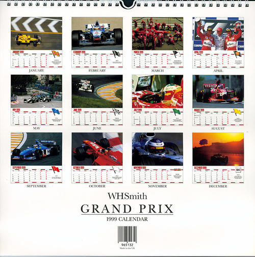 WHS Grand Prix 1999 Calendar w/ Images of Race Cars sponsored by Mild Seven, Marlboro, Benson & Hedges, Winston, West, etc. Made in UK.