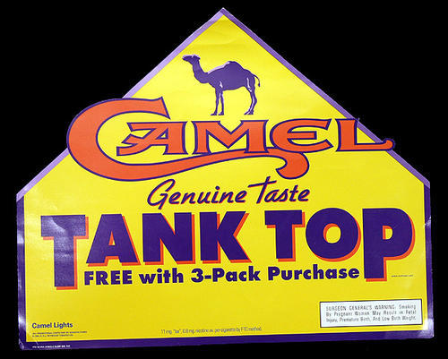 Sign-poster. Camel Genuine Taste, Tank Top free with three pack purchase. Yellow and purple.