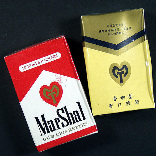 10 pack of gum- China. One pack looks like 555 state express pack, other looks like Marlboro pack.