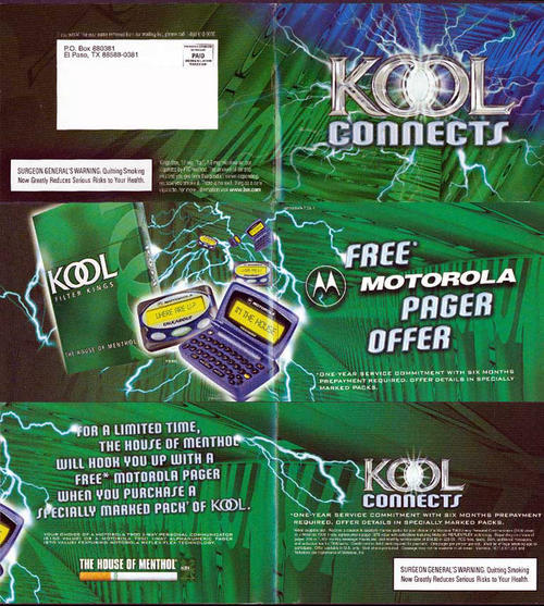 Direct Mail from Kool: "Kool connects. Free motorola pager offer.One-year service commitment with six months prepayment required. Offere details in specially marked packs. For a limited time, the House of Menthol will hook you up with a free* Motorola pager when you purchase a specially maked pack* of Kool. Your choice of a motorola T900 2-ay personal communicator ($150 value) or a Motorola T350 1-way alphanumeric pager ($70 value) featuring Motorola reflex/flex technology". Targeted at young people, and likley at African American market.