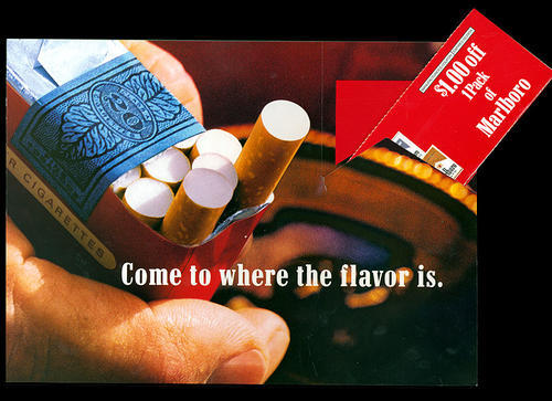 Direct mailing of a Marlboro coupon booklet. Front says, "Come to where the flavor is."