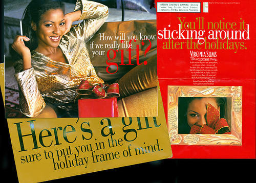 Virginia Slims mailing for the holiday season. Coupons and a magnetic photo frame.