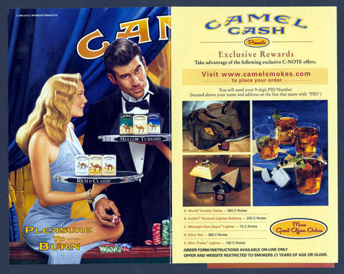 Direct Mail from Camel. Cover image of elegant man in tuxedo smoking. "Find your Flavor". inside: same man with elegantly dressed ladies who are serving him various Camel blends. "Options are everything. Camel's family of smokes has something for every taste and every occasion". Showcases different blends: Exotic Blends, Turkish and Classic. promotes website and includes coupons for packs and cartons.