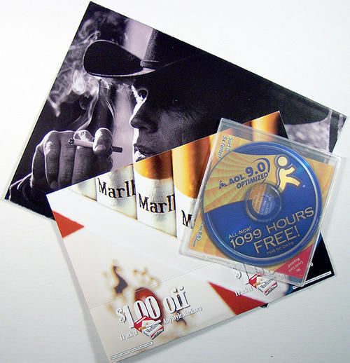 Direct Mail from Marlboro sent in plastic bag. Includes mailer piece from Marlboro, as well as a cd from AOL (America OnLine). Marlboro mailer piece is a large holder for coupons. One side features image of cowboy smoking with the text simply displayed, "Come to where the flavor is. Marlboro". Other side features graphic image of cigarettes that can be pulled out. includes 6 $1.00 off a pack coupons. AOL disc is for 1099 Free hours for 50 days of AOL 9.0 Optimized. Interestingly, Marlboro mailer does not include a reference to the AOL disc, but the two items were packaged and mailed together in the same bag.