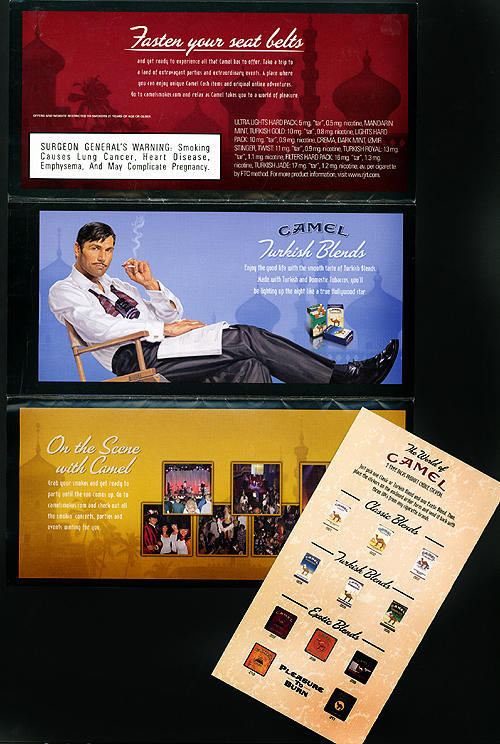 Direct mail from Camel modeled after an airline ticket. Text on outer flap: "The World of Camel, Here's your ticket to Indulgence." Text on inner top flap: "Fasten your seatbelts and get ready to experience all that Camel has to offer. Take a trip to a land of extravagant parties and extraordinary events. A place where you can enjoy unique Camel Cash items and original online adventures..." Bottom inner flap shows images of Camel parties. The middle flap "ticket" section advertises the Turkish Blends and Exotic Blends as well as the Camel website and Camel Cash items. Further inside is an offer for two free packs when returning an included survey and three Camel pack UPCs.