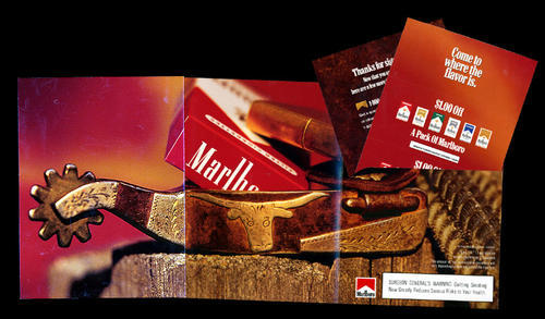Direct Mail from Marlboro - the welcome mail piece. This was the first direct mail package recieved by an individual after mailing list sign up. The cover is just an image of the chevron logo in rustic color and background. 2nd cover (inner flap) is an image of the various Marlboro blends with the text: "Welcome to Marlboro Country". Inside is a an image of a Marlboro pack next to "cowboy" themed items. A pocket inside the mail piece contains 6 coupons and a "thank you" note for signing up (with additional information for getting in touch with Marlboro and for friends who also want to sign up). The pocket also contains a "Take a minute. Tell us more" survey with various questions about brand preference.