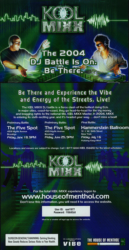 Direct mail from KOOL in promotion of it KOOL MIXX DJ battle event. Likely sent in spring of 2004. Cover shows illustration of two djs spinning records with the text, "The 2004 DJ Battle is on. Be there." Inside the piece are details of event dates and locations.