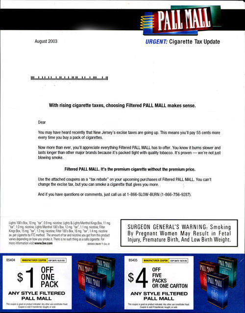 Text: "You may have recently heard that New Jersey's excise taxes are going up. This means you'll pay 55 cents more every time you buy a pack of cigarettes. Now more than ever, you'll appreciate everything Filtered Pall Mall has to offer. You know it burns slower and lasts longer than other major brands because it's packed tight with quality tobacco. It's proven - we're not just blowing smoke. Filtered Pall Mall. It's the premium cigarette without the premium price. Use the attached coupons as a "tax rebate" on your upcoming purchases of Filtered Pall Mall. You can't change the excise tax, but you cn smoke a cigarette that gives you more. And if you have any questions or comments, just call us at 1-800-SLOW-BURN (1-866-756-9287)."