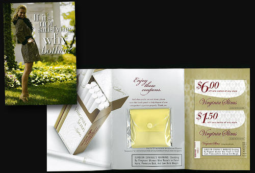 Direct mail piece from Virginia Slims including a small pouch intended for "disposing extinguished cigarettes properly". Piece also comes with 4 coupons (2 for $1.50 off any two packs, and 2 coupons for $6.00 off a carton).