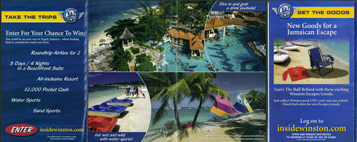 Prize includes a 5 day trip for two to a resort in Negril, Jamaica. Readers are directed to enter online at Winston's website, and to check the site often for updates. In addition, the piece advertises its brand loyalty program and again directs readers to the website to shop for items redeemable with Winston pack UPCs. Finally, the piece also includes 5 coupons (3x $4.00 off a carton, 2x $1.00 off of two packs).