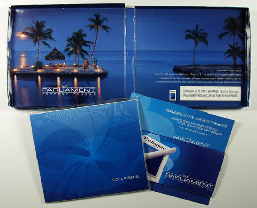 Direct mail gift from Parliament in time with the winter holidays. Includes a pack of blue colored cd labels and 6 coupons ($1.00 off 1 pack coupons). "Season's Greetings" "Here's something special for your holiday mixes. It's your gift from Parliament."