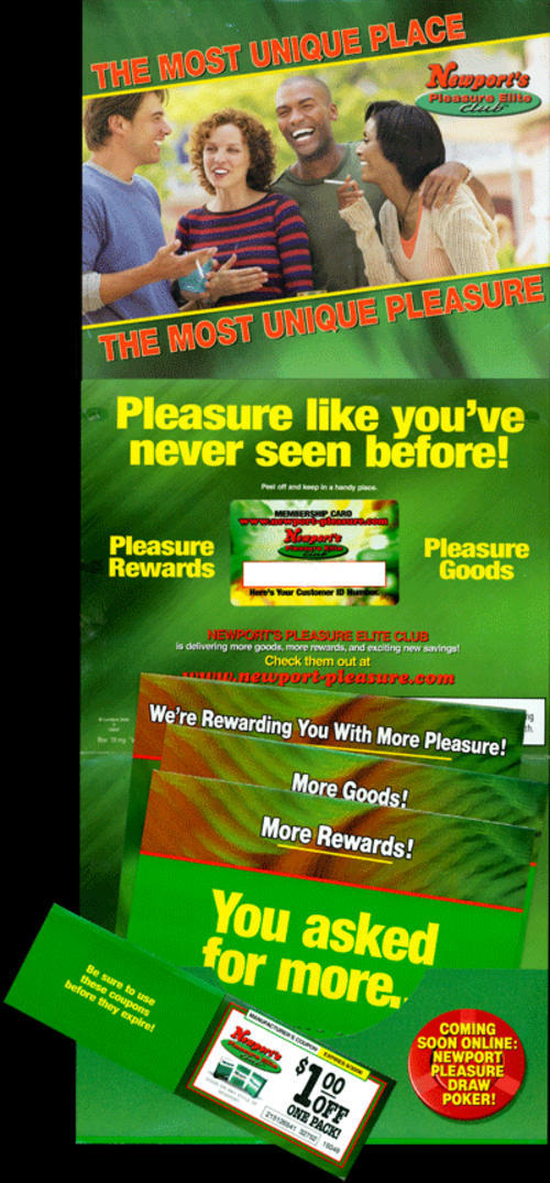 Direct mail from Newport in promotion of its "Pleasure Elite Club" campaign. Highlights the different reward programs available online with use of Newport UPCs. Comes with a "membership card" and three coupons.