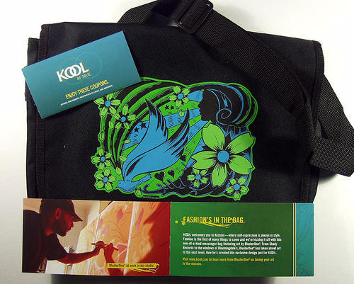 Direct mail gift item from Kool - a messenger bag with a design created by one of Kool's featured artists. Piece comes with a small booklet describing the promotion: "Kool welcomes you to Kustom - where self-expression is always in style. Fashion is the first of many things to come and we're kicking it off with this one-of-a-kind messenger bag featuring art by BlusterOne."