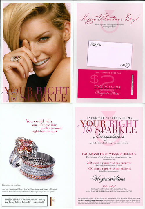 Valentine's day themed direct mail from Virginia Slims, in promotion of a sweepstakes to win one of two types of pink diamond rings. "Your right to sparkle". The provided entry form includes several questions about brand and cigarette preferences. Piece also comes with a notepad and 4 cigarette coupons (2 for $2 dollars off three packs; 1 for $1.00 off two packs; one for $5.00 off a carton).