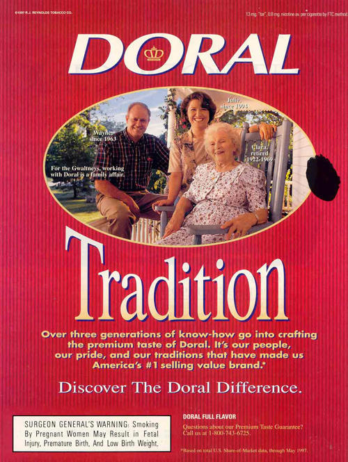 1997 ad for Doral cigarettes with a picture of a family, caption reads 'for the Gwaltney's, working with Doral is a family affair. Text: "DORAL -Tradition" "Over three generations of know-how go into crafting the premium taste of Doral. It's our people, our pride, and our traditions that have made us America's #1 selling value brand"