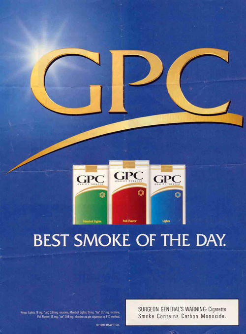 1998 GPC advertisement -3 packs, Menthol Lights, Full Flavor and Lights, on a blue background. Text: "GPC" "Best Smoke of the Day"