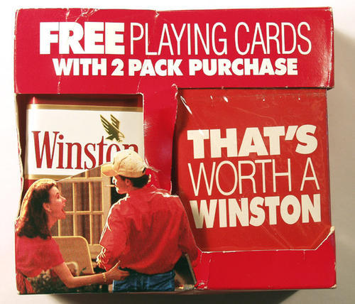Free playing cards with 2 pack purchase. Red box with picture of woman grabbing for smoking man.