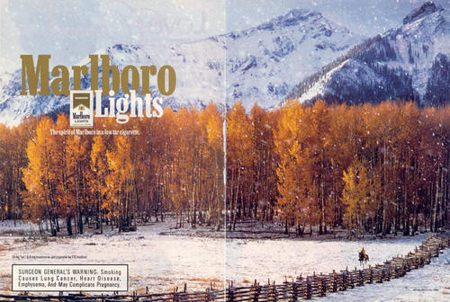 1994 ad for Marlboro Lights showing a winter landscape, trees and snow covered mountains in the background and a figure on horseback behind a wooden fence in a snowy pen.