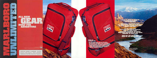 Marlboro ad from 1996, advertising a backpack from Unlimited Gear. Text: "MARLBORO UNLIMITED. All new GEAR built for adventure"