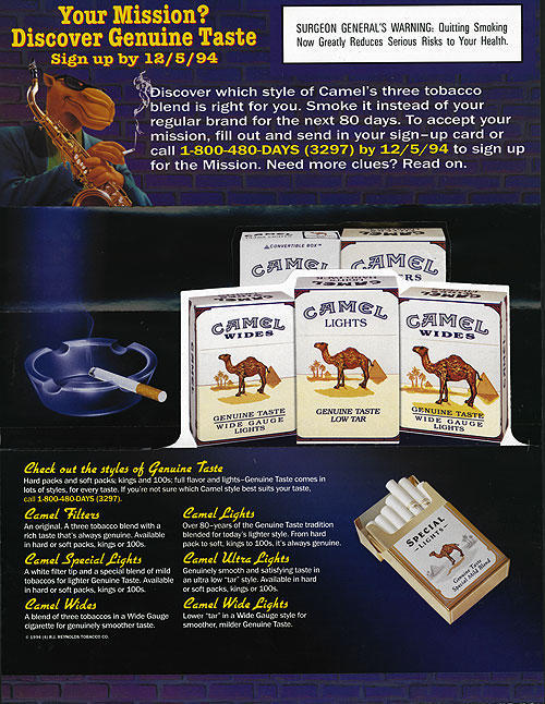 Final reminder from Camel for receivers to sign up and participate in the "Genuine Taste Mission", a campaign which asks receivers to agree to smoke Camel cigarettes for the next 80 days instead of their regular brand, and then to fill out and mail in 3 surveys. Camel cigarettes are not provided for the "mission", but a free carton of Camel cigarettes is offered upon completion of the surveys. Respodents who save 75 UPCs from their smoked Camel packs will also receive a Camel Zippo. The mailing also states the additional related mailings will provide cigarette coupons and bonus Camel Cash notes. Finally, this piece comes with a "sign up" form to participate in "the mission" and with a "buy one pack get one pack free" coupon, presumably to help receivers get started.