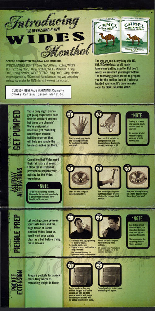 Direct mail from Camel in promotion of Camel's menthol wides packs. Piece provides humorous "tips" on how to "get ready" for the Camel Menthol Wides, such as adusting the shape of one's ashtray and jean pocket size. Also comes with coupons and an offer for two artist designer packs of a Camel Wides style (menthol or regular) and a lighter for 10 pack UPCs.