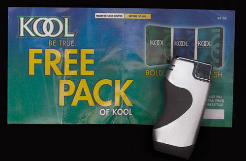 Coupon for a free pack of Kool and a free lighter presented as a giveaway by Kool representatives in a bar. These materials were distributed in a bar in Washington DC.