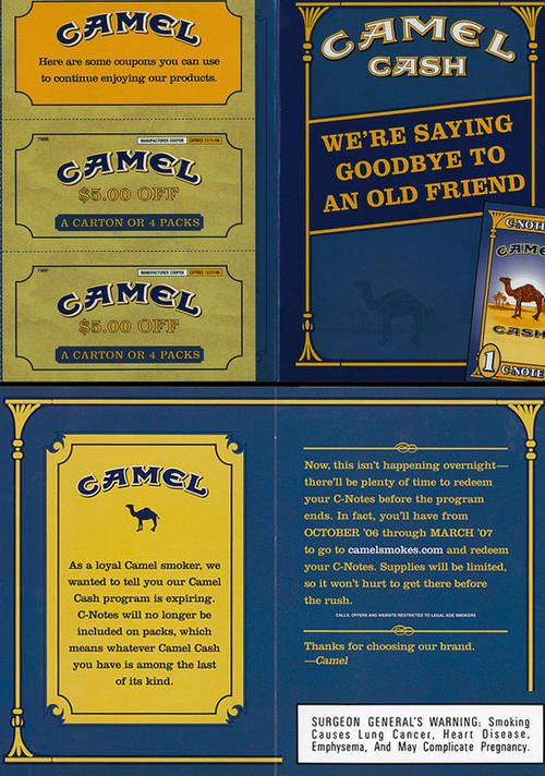 Direct mail from Camel informing receivers of the upcoming end of the Camel Cash brand loyalty program in March 2007. Piece also comes with 2 coupons.