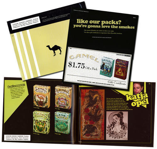 Direct mail from Camel in the form of an illustrative booklet, showcasing the work and profiles of 14 different artists who designed a total of 33 different Camel packs. Piece also came with two coupons (called "Gift Certificates" here).