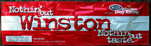 Red and White. "Nothing but Winston" "Nothing but taste" "Sponsor of NHRA Winston Drag Racing".
