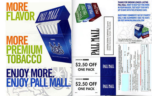 General promotional direct mail from Pall Mall, with 2 coupons and a mail in card for updating your personal profile.