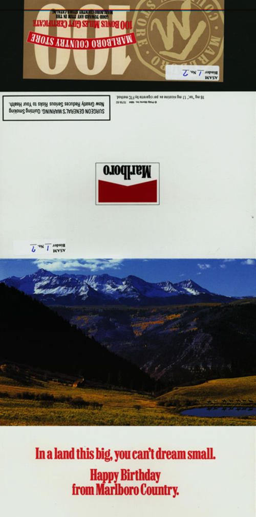 Birthday card sent by direct mail from Marlboro with a \"gift\" of 100 bonus Marlboro Miles that can be used to redeem catalog items.
