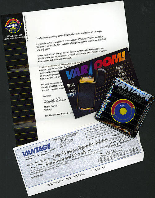 Letter from Vantage thanking the receiver for responding to the free pocket ashtray offer. Comes with two pocket ashtrays and cigarette coupon in the style of a check.