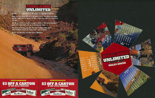Direct mail from Marlboro providing receivers with the latest catalog, 4 coupons, and a Marlboro Miles "Saver" (see right). Users can unfold the "saver" construction to create a 3D hexagon form, which can then hold collected Marlboro Miles that are inserted into from the slit at the top.