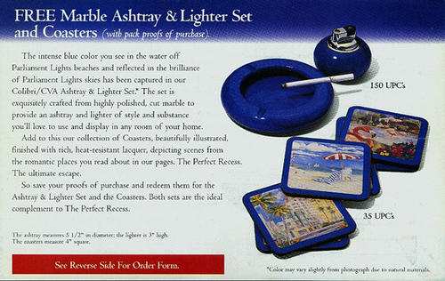 Offer from Parliament for a marlbe ashtray and lighter set and coasters, each offered for a certain number of Parliament pack UPC codes. Order form included.