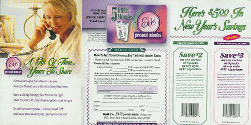 General promotion for Eve cigarettes, with a free 5 minute phone card included as a gift. Also includes an offer for additional phone card minutes in exchange for payments of EVE pack UPC codes. Piece also came with two coupons.