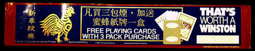Red with gold and white print poster. Shows a rooster and writing in Chinese, Japanes and English. "Free playing cards with 3 pack purchase. That's worth a Winston". Pack of playing cards shown.