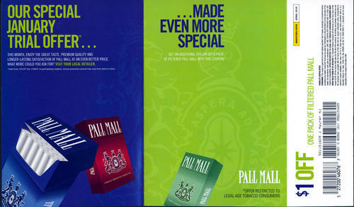 General promotional direct mail from Pall Mall, indicating a special offer for Pall Mall cigarettes in stores in January. Piece came with 1 cigarette pack coupon.