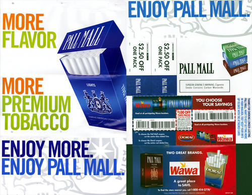 Direct mail from Pall Mall, with two coupons for cigarette packs and a mail in suvey card for updating one's smoking preferences.