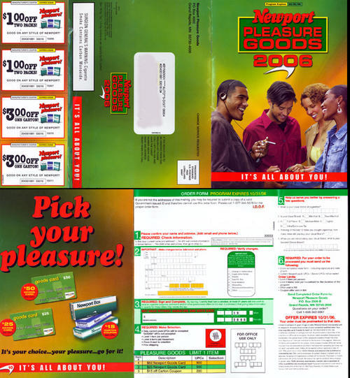2006 Newport Pleasure Goods Catalog sent by direct mail, including items available for redemption with collected Newport pack UPC codes. Catalog order form included. Direct mail piece also included 4 cigarette coupons, and a bonus coupon worth 25 UPCs good towards catalog orders.