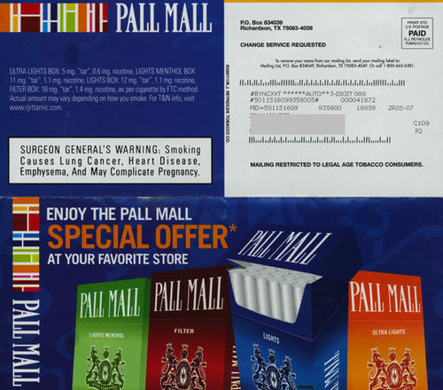 Direct mail with discount coupons for Pall Mall cigarettes to be used specifically in 7-11 convenience stores. Another version of this direct mail piece provides coupons for Wawa convenience stores.