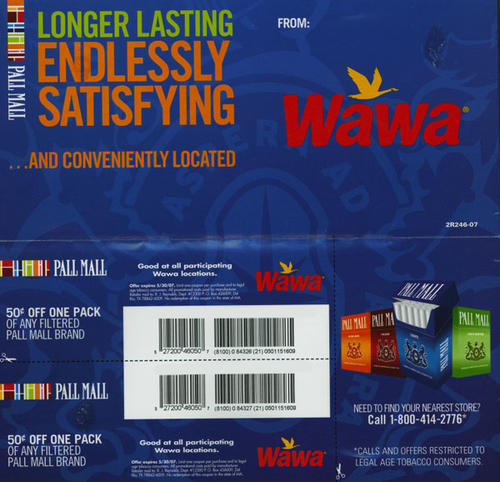Direct mail with discount coupons for Pall Mall cigarettes to be used specifically in Wawa convenience stores. Another version of this direct mail piece provides coupons for 7-11 convenience stores.